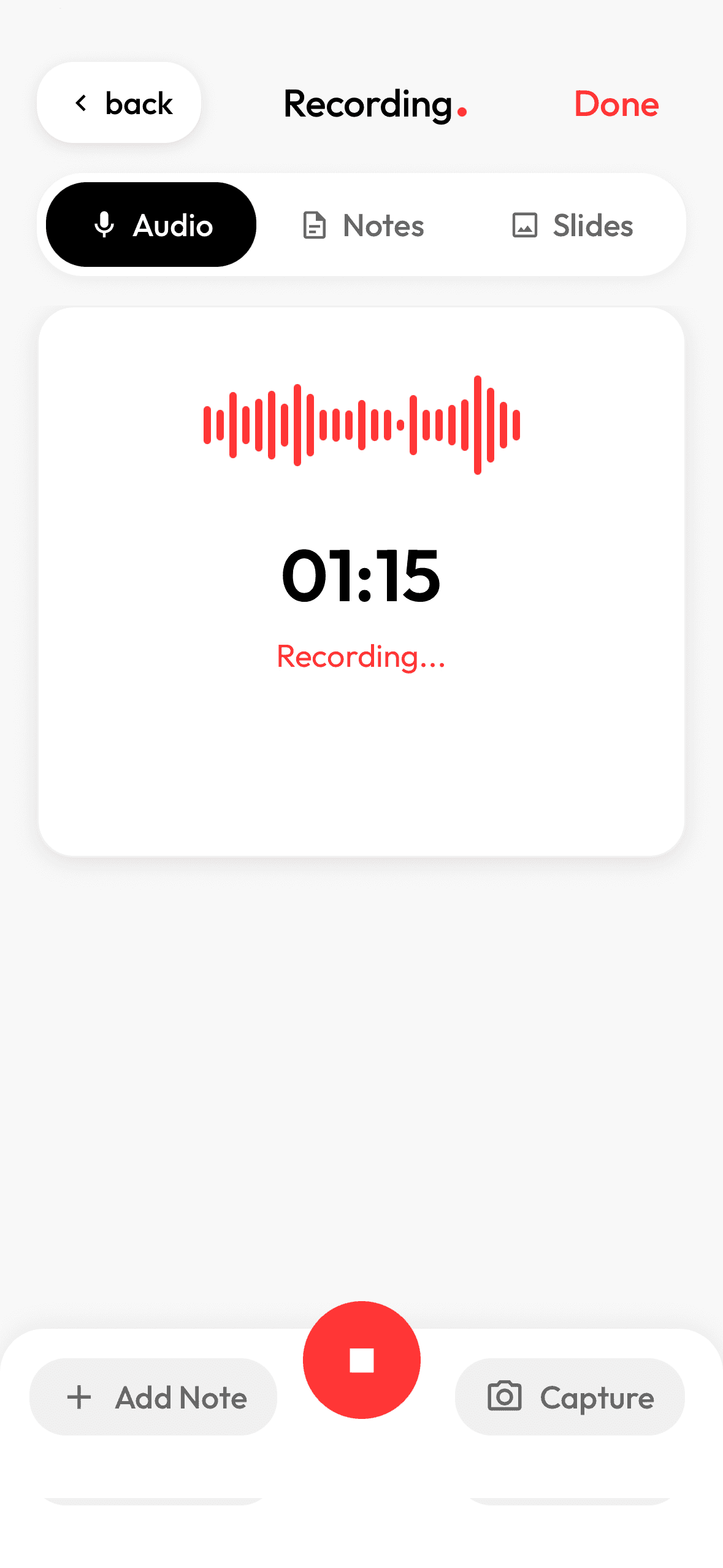 Unlike traditional note-taking apps, recaid captures the entire context — audio, slides, notes, and summaries. It’s built for listening and understanding, so no insight gets lost while you stay focused.